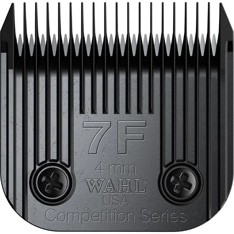 Wahl’s Ultimate Competition Series blade sets provide 2.5 times faster show quality cutting than the original Wahl Competition Series blade sets. Ultimate Competition Series blade sets are designed for smooth feeding that leaves no clipper tracks. They are made with hardened steel for durable and long lasting blades that stay sharp. Fine Tooth Blades give a finer finished look to the coat. These are best used on fine and soft coats, for example any fluffy breeds. The final clip will be very even looking and really smooth. Fine tooth blades are distinguished by the letter “F” after the number, for example 3F, 4F, 7F. These blades will work beautifully for dogs whose coats are regularly clipped and/or brushed, however will not work on a matted dog or breeds with a thick undercoat. The #7F Full Medium Coarse Competition Series Blade features a 4mm cutting length. This blade set fits all Wahl, Oster, Andis and all detachable style clippers.