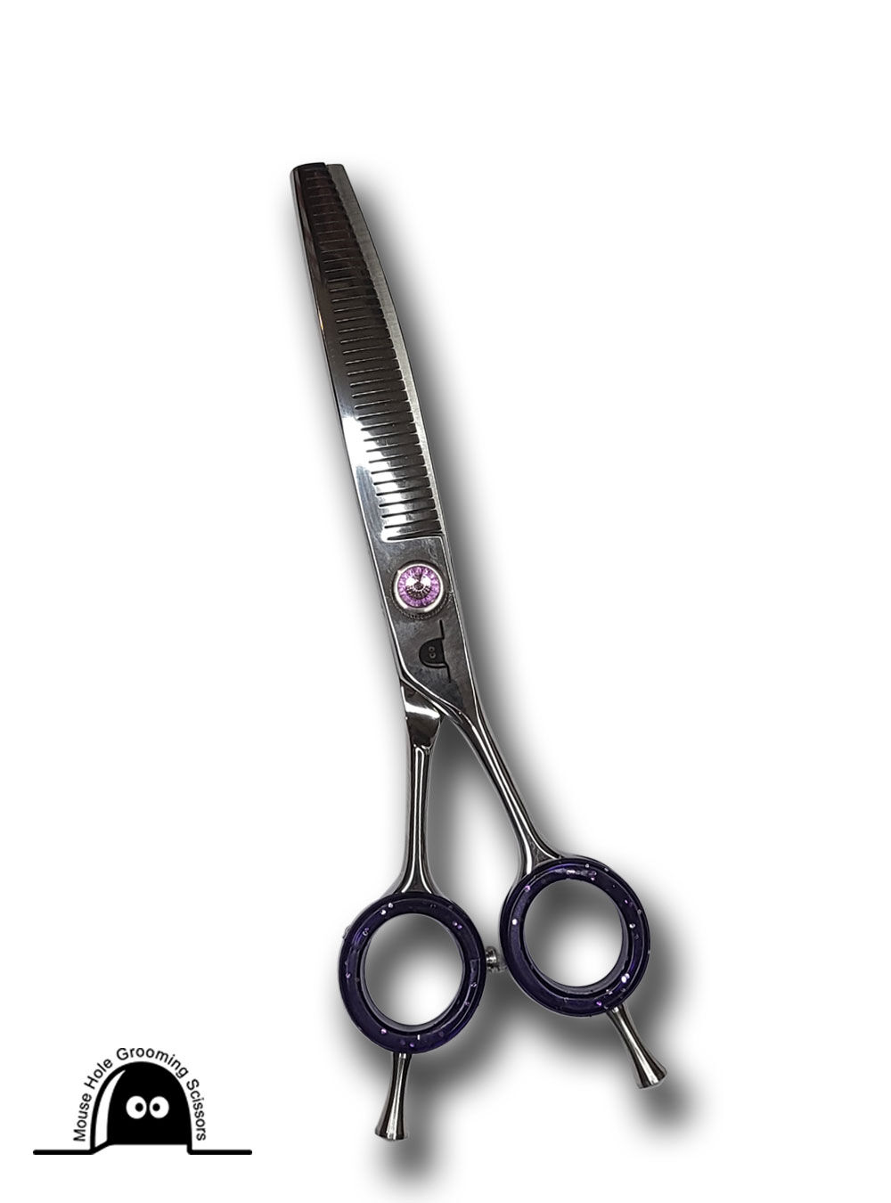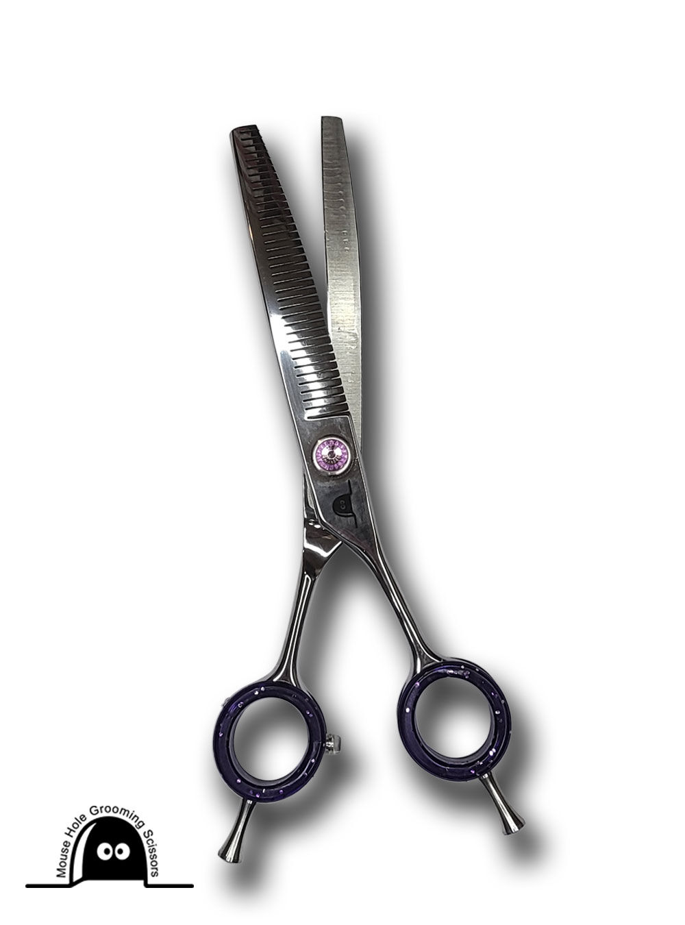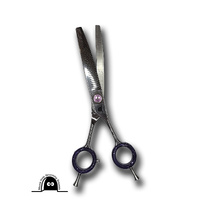 Whippet  6.5″ Curved Blenders, right-handed pet grooming scissors. Whippet 6.5” Curved Blenders remove approximately 50% of the coat and remove cut lines whilst the curve helps you finish and shape your groom. All Mouse Hole Pet Grooming Scissors are top-quality Japan 440c steel. They sharpen well and hold their edge.