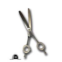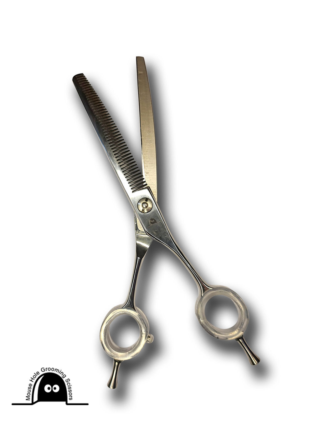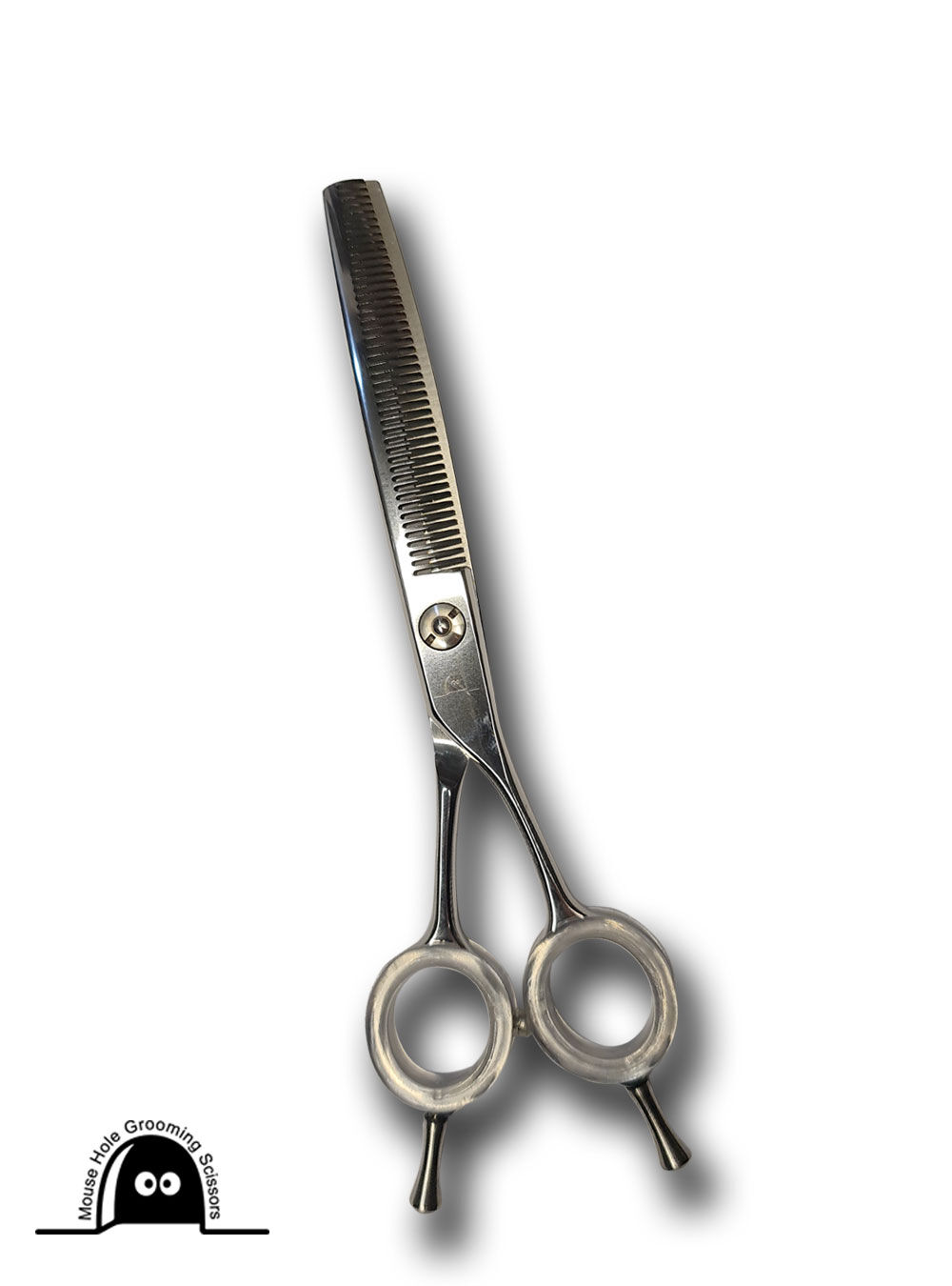 Whippet  6.5″ Curved Thinner, right-handed pet grooming scissors. Combining bulk removal with shaping at the same time. Whippets have straight-set handles for flipping, giving you better shaping ability. Slim but sturdy, the Whippet is suitable for thinning and shaping the top of the head, muzzle, around the legs, tail and feet. All Mouse Hole Pet Grooming Scissors are top-quality Japan 440c steel. They sharpen well and hold their edge.
